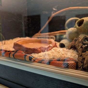 As a Honduran milk snake, Hocus is always on the go. He’s confident, inquisitive, and loves to explore... especially sleeves and pockets! Rather than sitting still, he prefers to keep moving, which makes handling him a really fun and interactive experience.